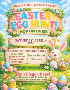 Hey Folks! Its that time of year. We’re getting ready for our annual EGG HUNT. We hope you’ll join us on Saturday, April 4, at 1:00pm. Everyone is invited so be sure to let all your friends know.